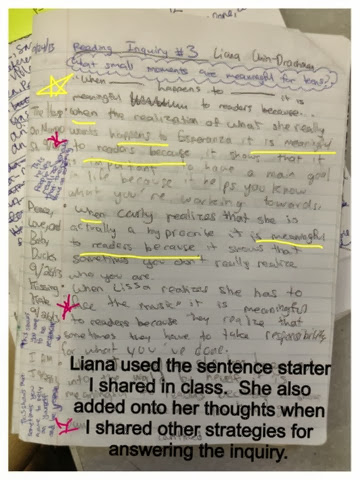 Notice how these readers had a space on their inquiry page for not just what they observed, but what they were thinking about their observation. After observing, think about what you can do to make your reading inquiries more meaningful, especially since you will be sharing them with your new book groups! You always want to be at your book group meeting with some ideas formed and ready to share!